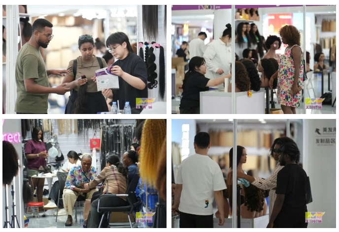 展品陈列区规划科学,覆盖发套、接发、发片等全品类产品,融合传统工艺与前沿设计,如高宾发制品、宣宇丝等品牌凭借创新设计吸引眼球。